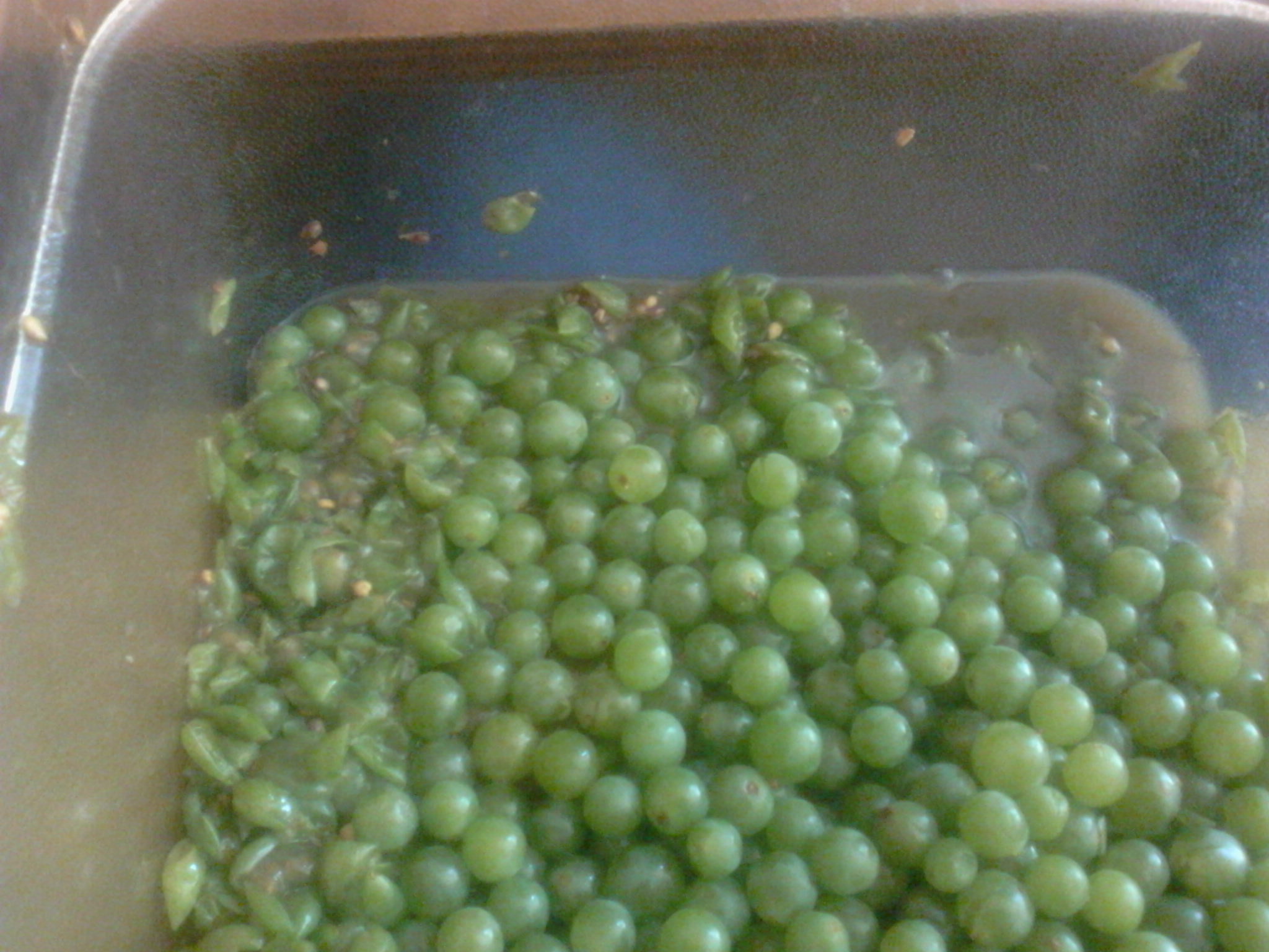 I now have about 85 million green grapes (give or take) in my kitchen which I will be turning into white wine. Some of them have been cleaned, de-stemmed, smashed, mixed with honey and deposited into Tillamook ice cream 3-gallon containers (obtained from the Tillamook store in Tillamook, OR for .50 apiece, thank you very much). That took two days. I have at least one more 3-gallon vat worth of grapes yet to process. By the time I’m finished, I will have touched every single one of these grapes.