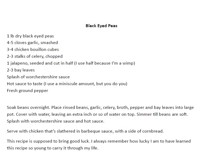 One of his friends brought over a huge pot of black eyed peas, chicken slathered in barbecue sauce, with cornbread on the side. As this older Black man watched me devour bowl after bowl of the peas, he sat next to young me and detailed his simple and healthy recipe.